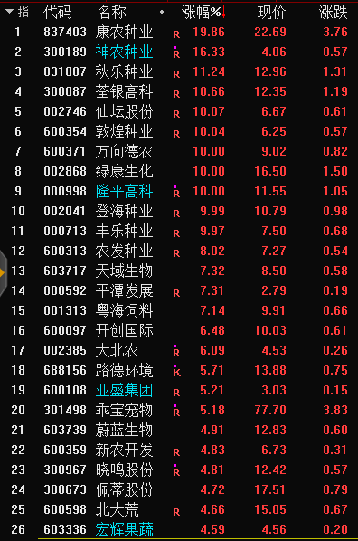 个股方面,95家农业股仅3家收跌1家收平,其余不同过程上扬。其中,康农种业、神农种业、秋乐种业、荃银高科猛涨19.86%-10.66%不等,仙坛股份、敦煌种业、万向德农、绿康生化、隆平高科、登海种业、丰乐种业等7家股票强势涨停,农发种业、大败农、亚盛集团等9股涨幅大于5%。